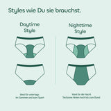 Nighttime Style - bei diesen Hosen ist die Techzone an der Rückseite verlängert bis zum Bund und meist mit einer hohen Saugstärke ausgestattet . Ideal wenn du schläfst.